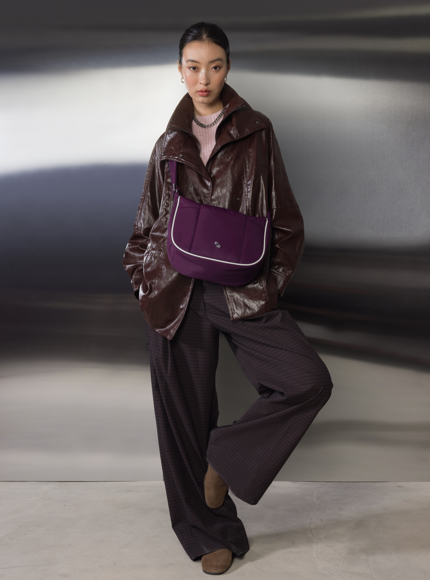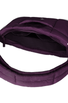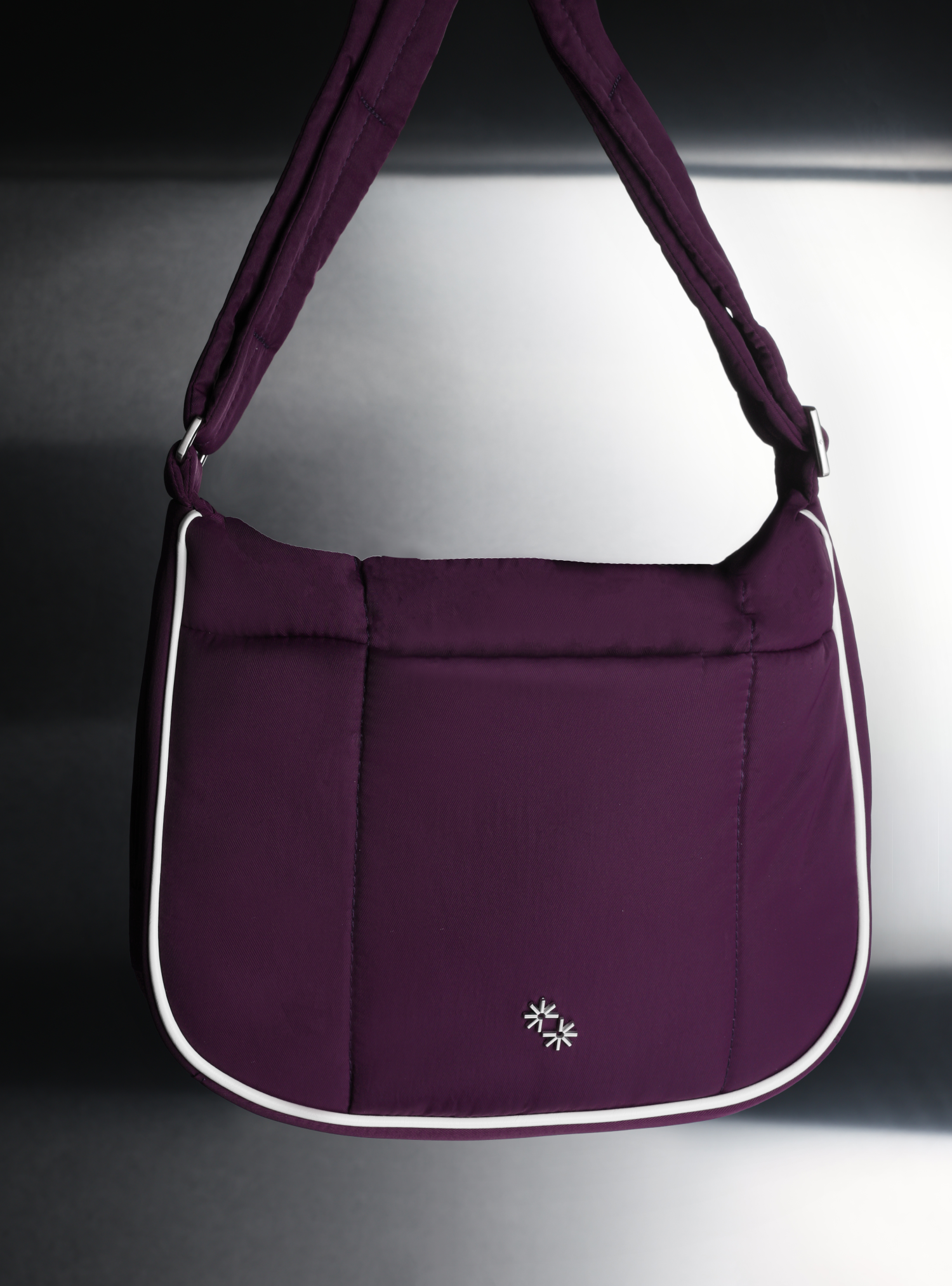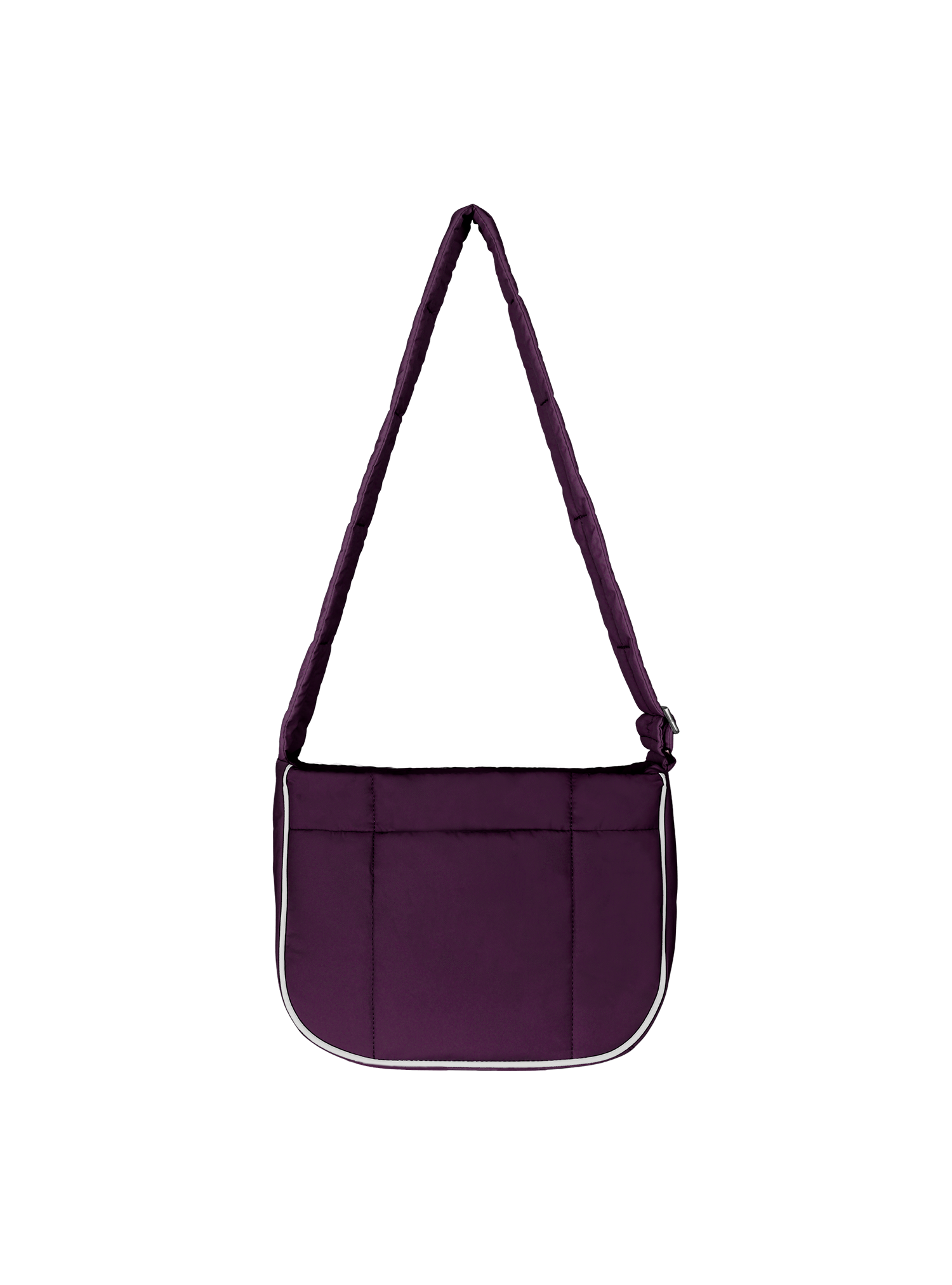 This Puffer Swing is an 80s-inspired shoulder bag made with smooth nylon, outlined in cream vegan leather piping for a refined, structured finish. Fits your daily essentials (even a water bottle and iPad), with interior and exterior zip pockets.