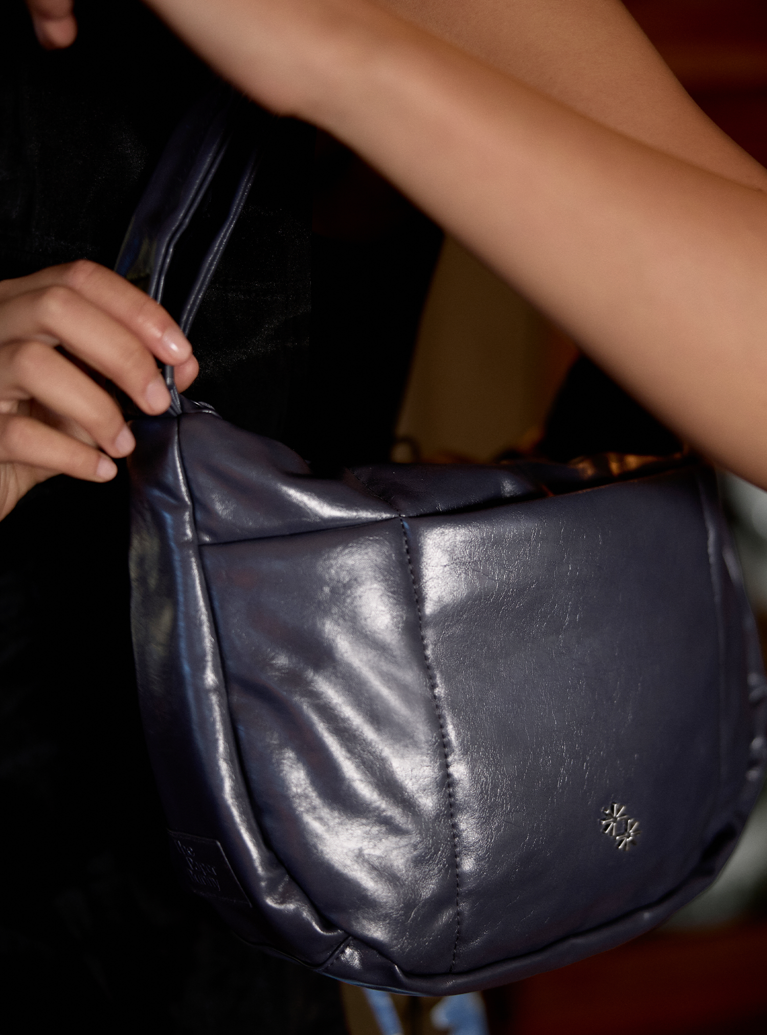 • Elevated aesthetic featuring a silver emblem and an understated embroidered label